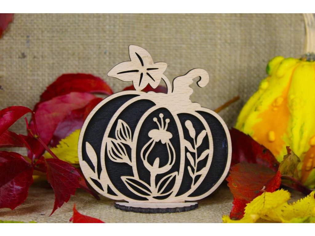 Podzimní dřevěná dýně s květinovým dekorem – stylová dekorace na stůl nebo parapet