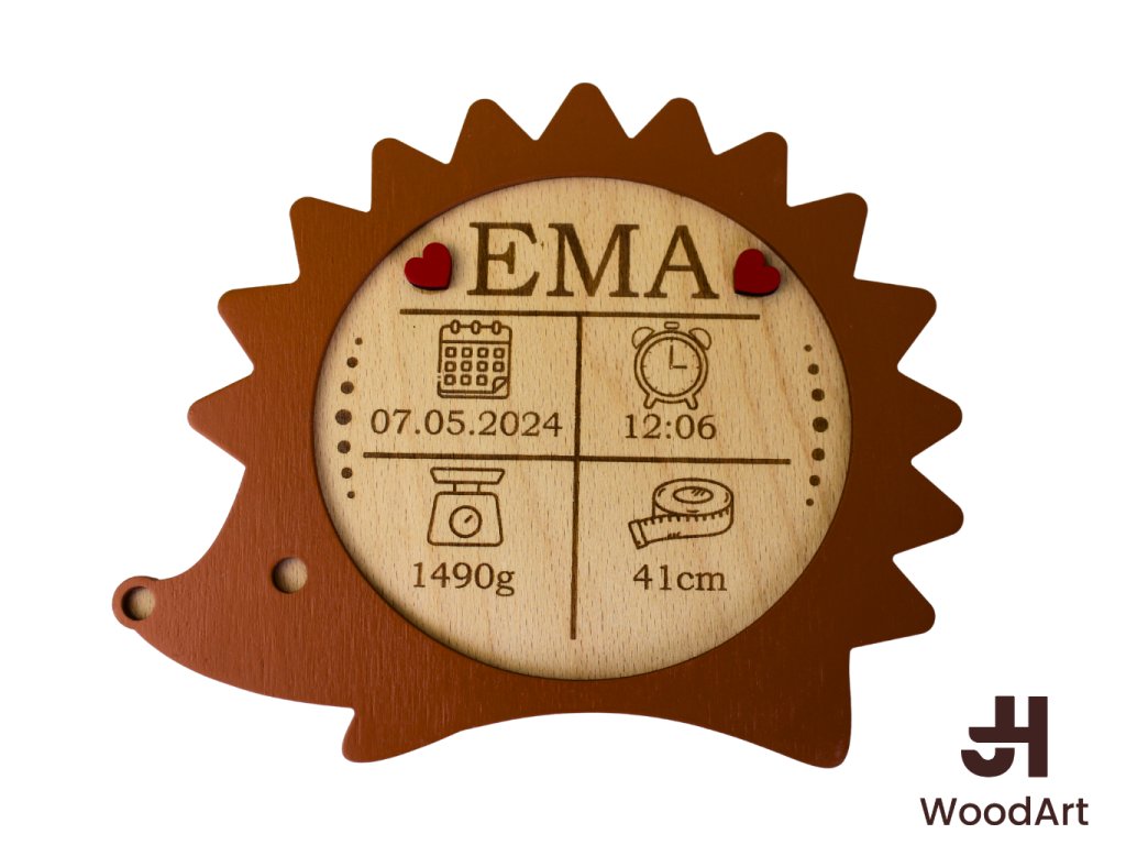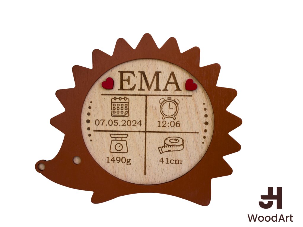 Originální dřevěná dekorace ve tvaru roztomilého ježka, která uchová ty nejcennější vzpomínky na narození vašeho miminka. Vyrobíme ji přesně na míru – se jménem dítěte, datem a časem narození, váhou i délkou. Je to krásná památka do dětského pokoje i jedinečný dárek pro rodiče, prarodiče či ke křtinám.
