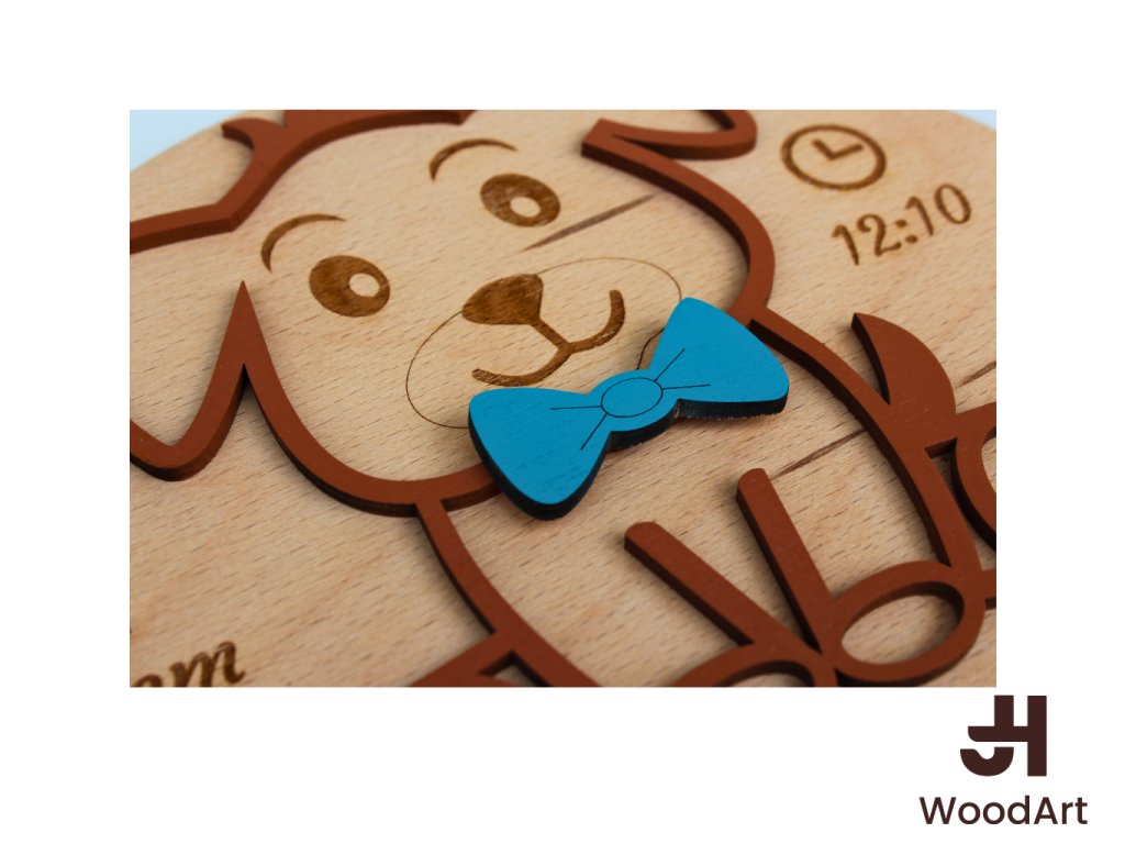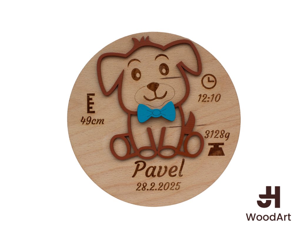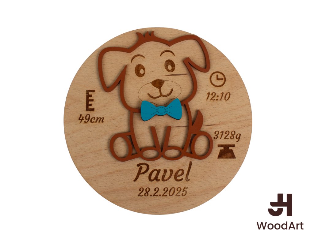 Roztomilá dřevěná dekorace ve tvaru kulaté destičky se štěňátkem uchová vzpomínku na narození vašeho dítěte. Vyrobíme ji na míru se jménem, datem, časem, váhou i délkou miminka. Barevné detaily, hravý motiv a kvalitní dřevo dělají z této památky krásný doplněk do dětského pokoje i originální dárek pro rodiče nebo prarodiče.