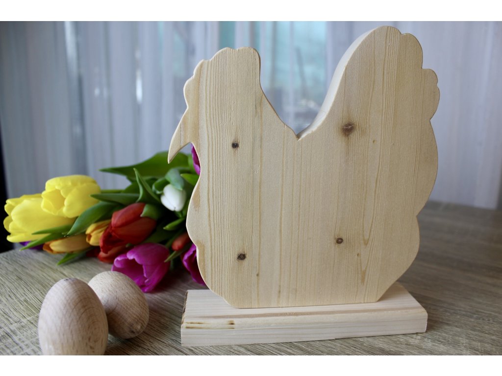 Rustikální dřevěná slepice na podstavci s jednoduchým designem, která elegantně doplní jarní nebo velikonoční výzdobu na parapet či stůl.