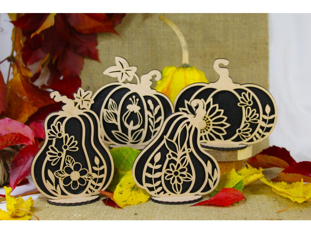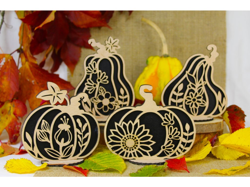 Sada 4 dřevěných dekorativních dýní – podzimní styl s květinovým vzorem