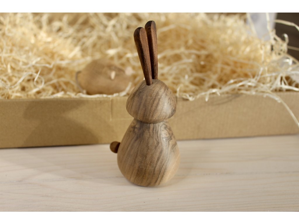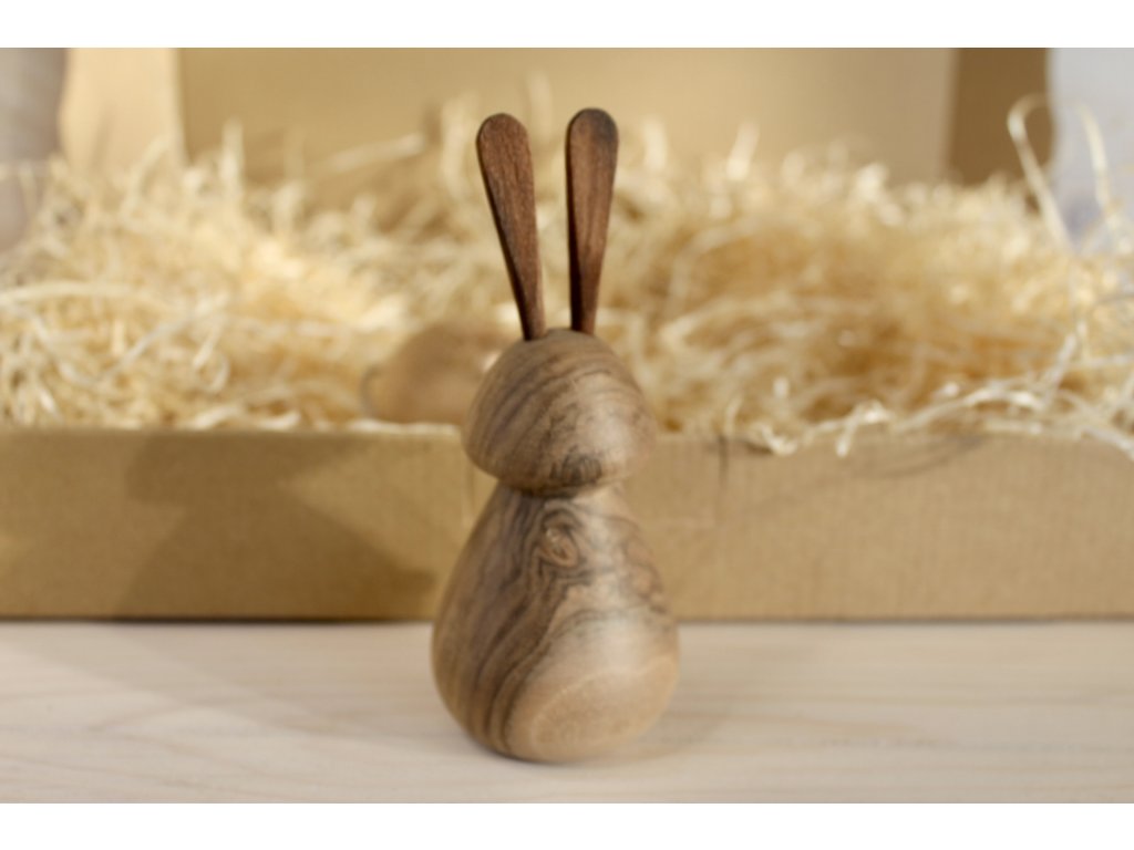 Jemný stylový zajíček s přirozenou siluetou a decentním zpracováním, vyrobený na soustruhu z ořechového dřeva – krásná dekorace do jarní výzdoby, dětského pokoje nebo jako součást velikonočních aranžmá.