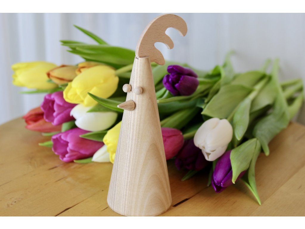 Elegantní minimalistický kohoutek z přírodního masivního dřeva – dekorace ideální pro jarní a velikonoční atmosféru.