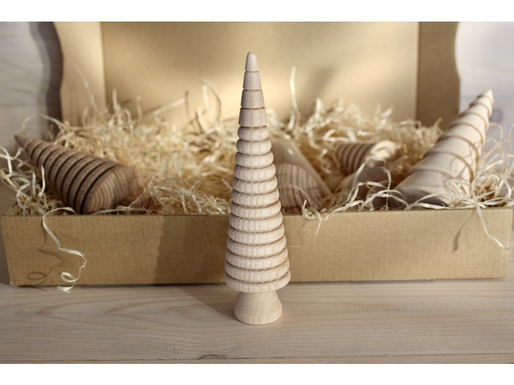 Tento dřevěný stromeček s jemným žebrováním je úžasnou ukázkou spojení precizní řemeslné výroby a minimalistického designu – každý kousek je ručně soustružený z kvalitního masivního dřeva a vybroušený do dokonalého tvaru.