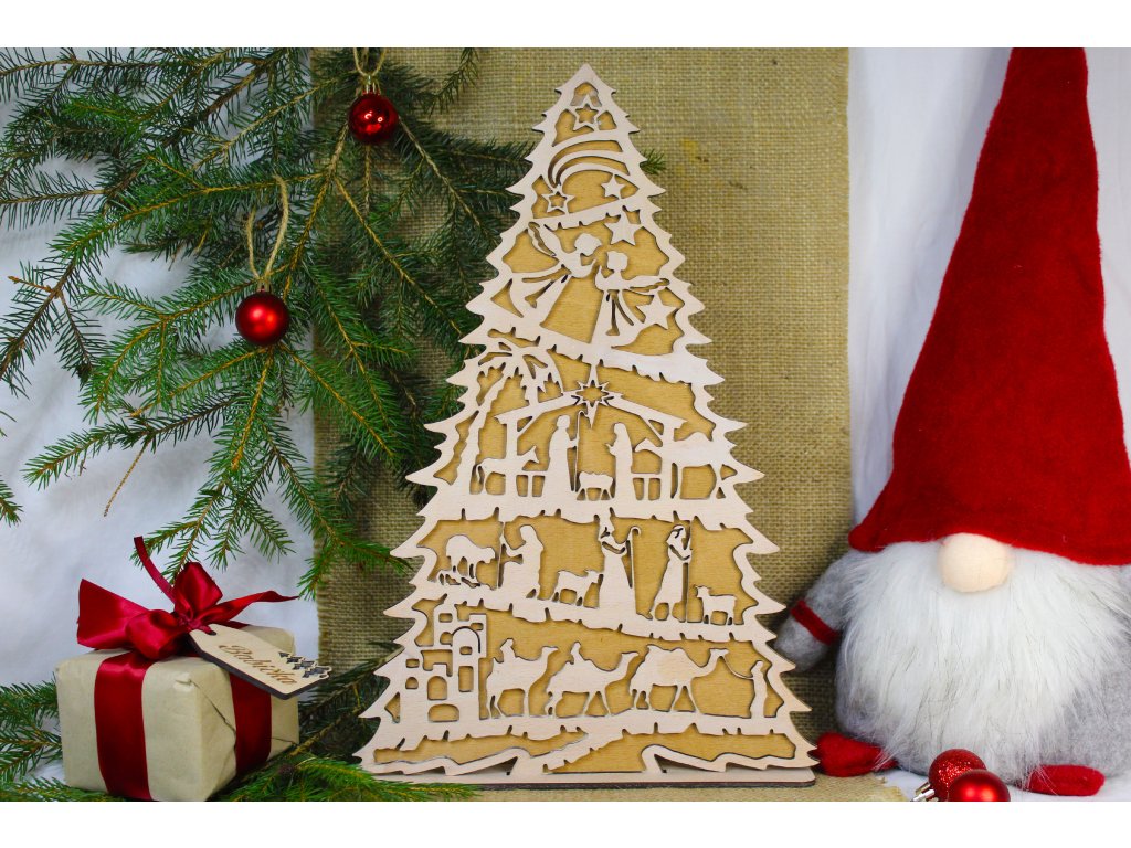 Dřevěný vánoční stromek s motivem betlému – originální sváteční dekorace