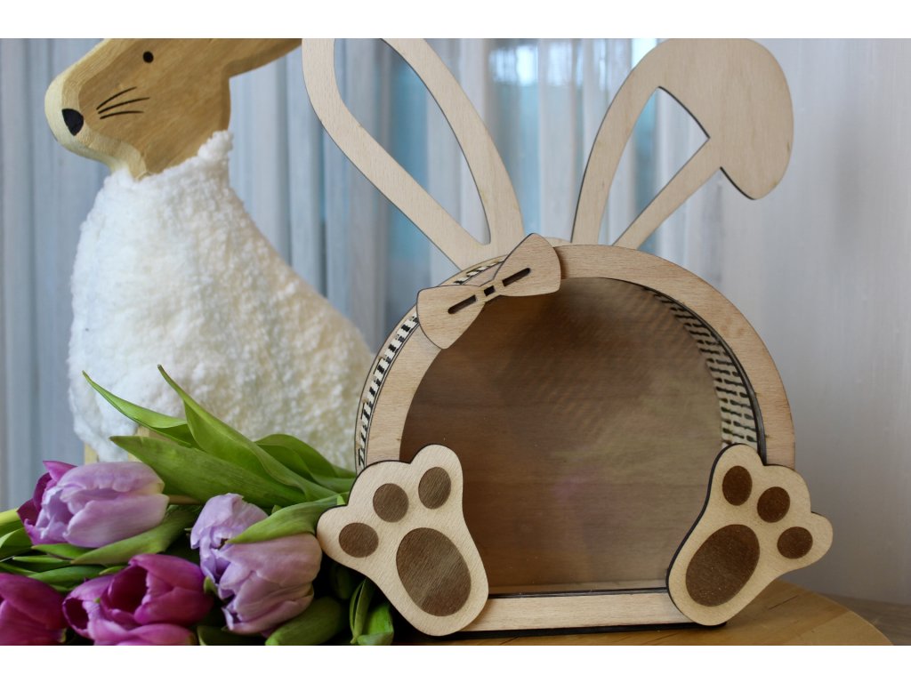 Tento dřevěný velikonoční zajíček kombinuje hravý design s praktickým využitím jako malý box nebo košík na bonbóny, čokoládky nebo jiné drobnosti.