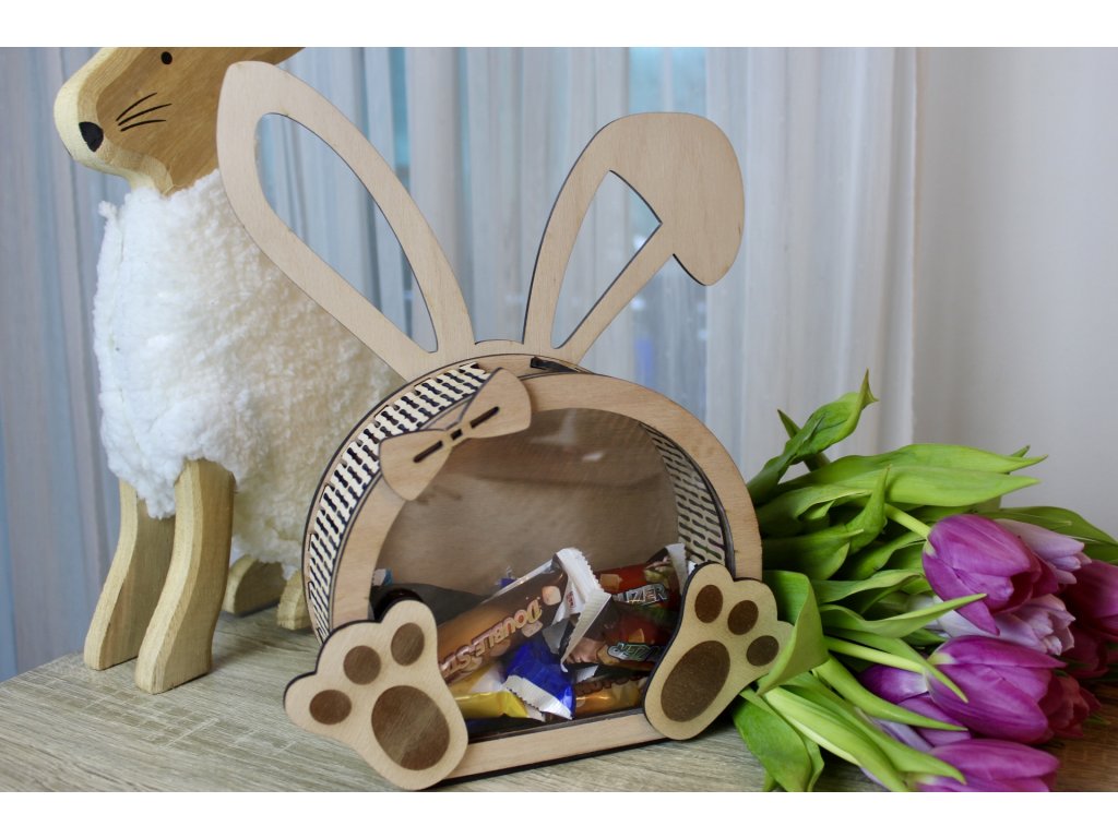 Roztomilý zajíček s oušky, mašlí a tlapičkami — praktická i stylová krabička na sladkosti, která propůjčí vašemu domovu jarní radost.