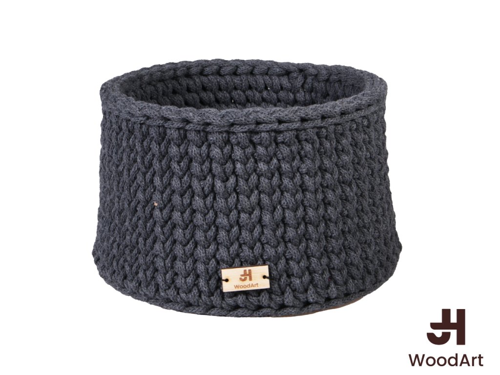 Dřevěné dno zajišťuje pevnost a stabilitu, zatímco háčkované stěny z kvalitní příze vytvářejí příjemnou texturu a hřejivý vzhled.