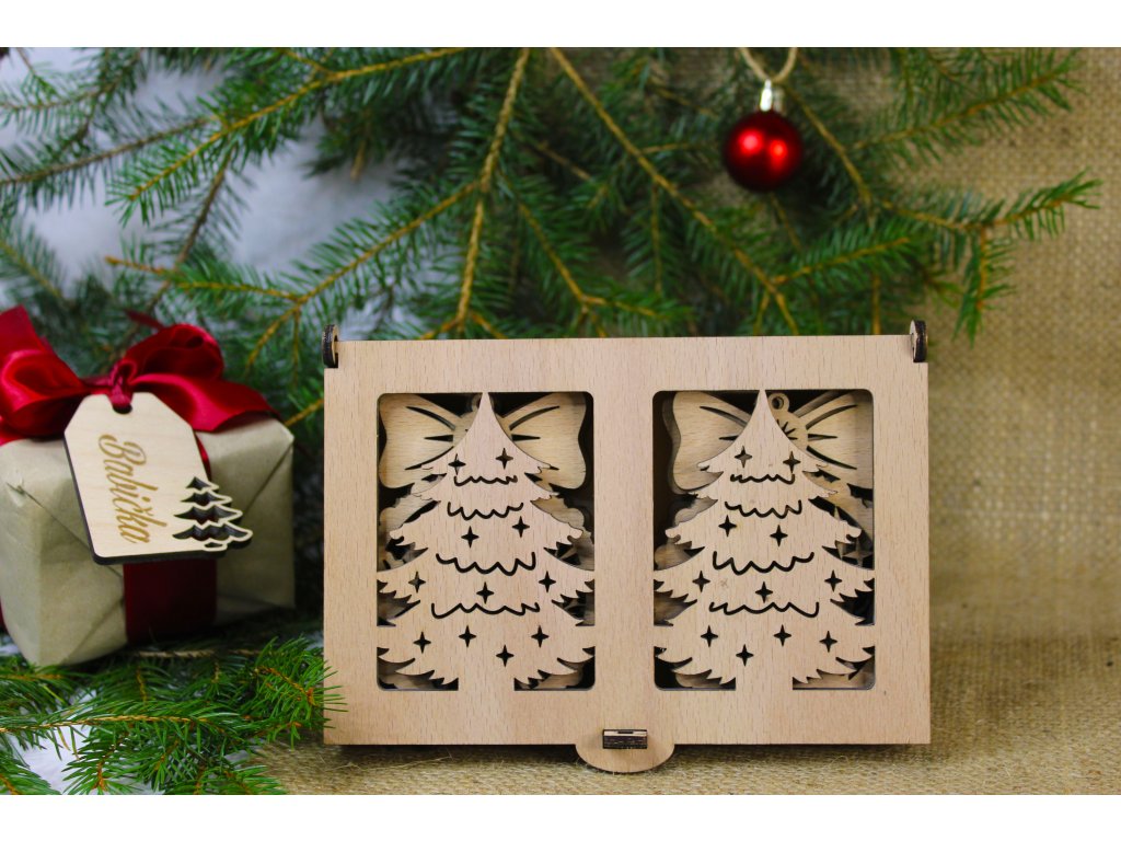 Kouzelná sada deseti dřevěných vánočních ozdob s motivy sobů a stromečků, pečlivě zpracovaných z bukové překližky a připravených k zavěšení. Součástí je stylová krabička, díky které je dekorace ideální do domácností, na stromeček i jako krásný dárek plný sváteční atmosféry